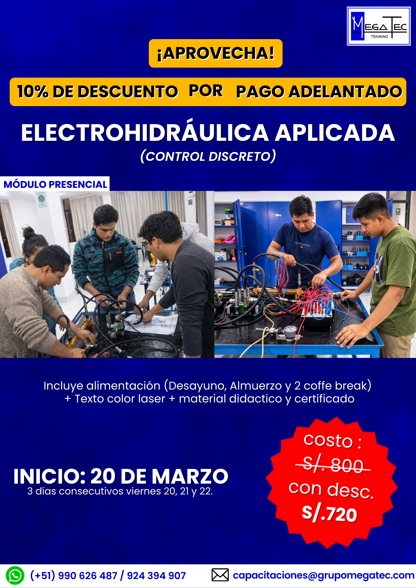 Este es el tercer curso presencial que se desarrolla en las instalaciones de MEGATEC TRAINING, para el cual contamos con módulos hidráulicos, electro válvulas industriales y de equipos móviles, PLC ALLEN BRADLEY 1400 y PC donde el participante podrá aprender desde las instalaciones electrohidráulicas mas básicas hasta el control de un sistema electrohidráulico con autómata.